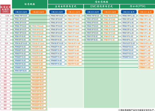 ●将EMC滤波器一体型、直流电抗器一体型及防水型(IP54)系列化。